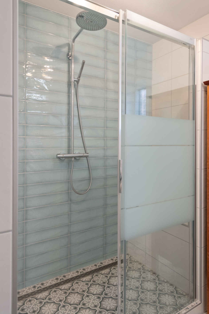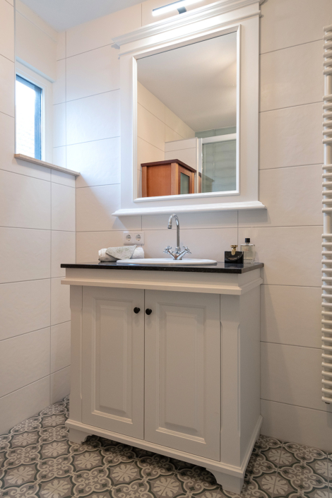 Naast de keuken lieten Annelies en Charles ook hun badkamer vernieuwen. “We gingen er eigenlijk helemaal blanco in, maar Jeffrey van Van de Breevaart Wonen heeft ons geweldig geholpen”. De oude badkamer had een kwartronde douchecabine met een hoge instap, wat als onpraktisch werd ervaren. “We hebben nu een inloopdouche met een glazen schuifdeur en een grote regendouche, wat een stuk ruimer en comfortabeler is. Het voelt nu echt als een luxe toevoeging aan ons appartement.”